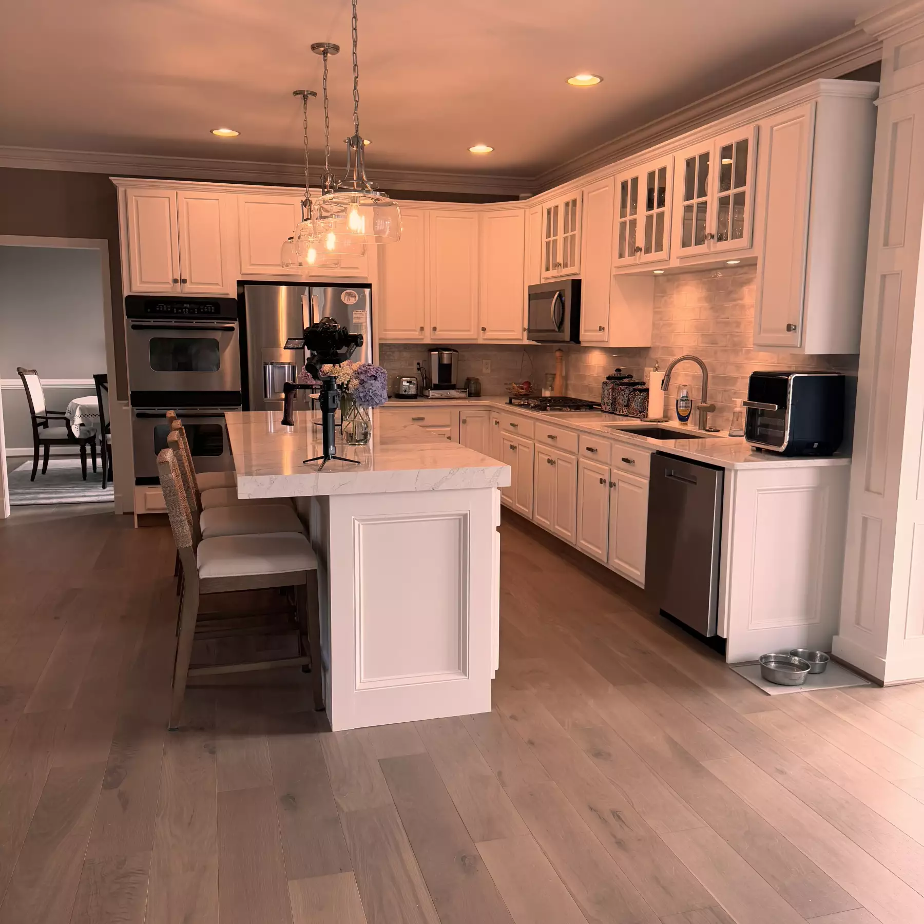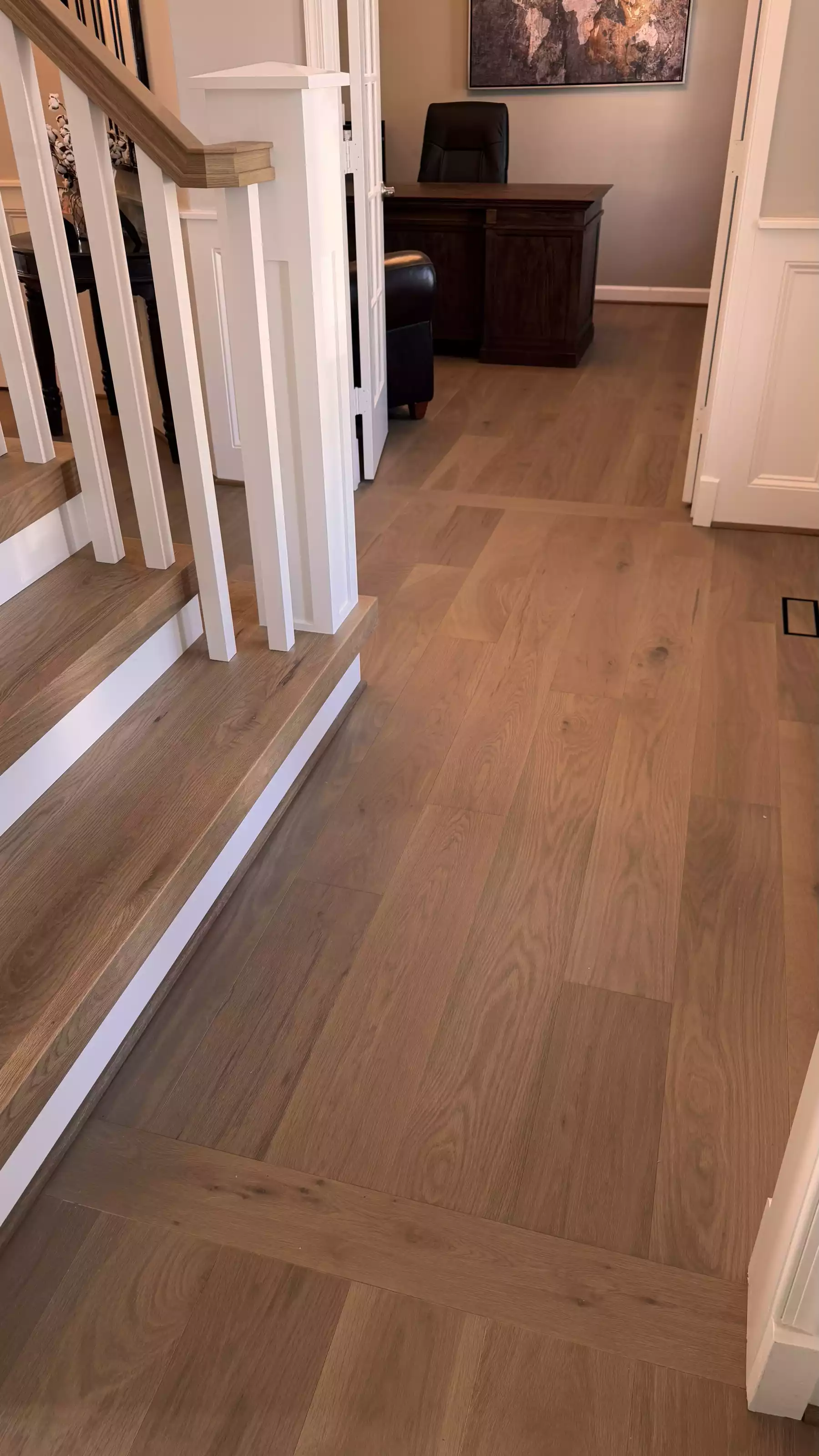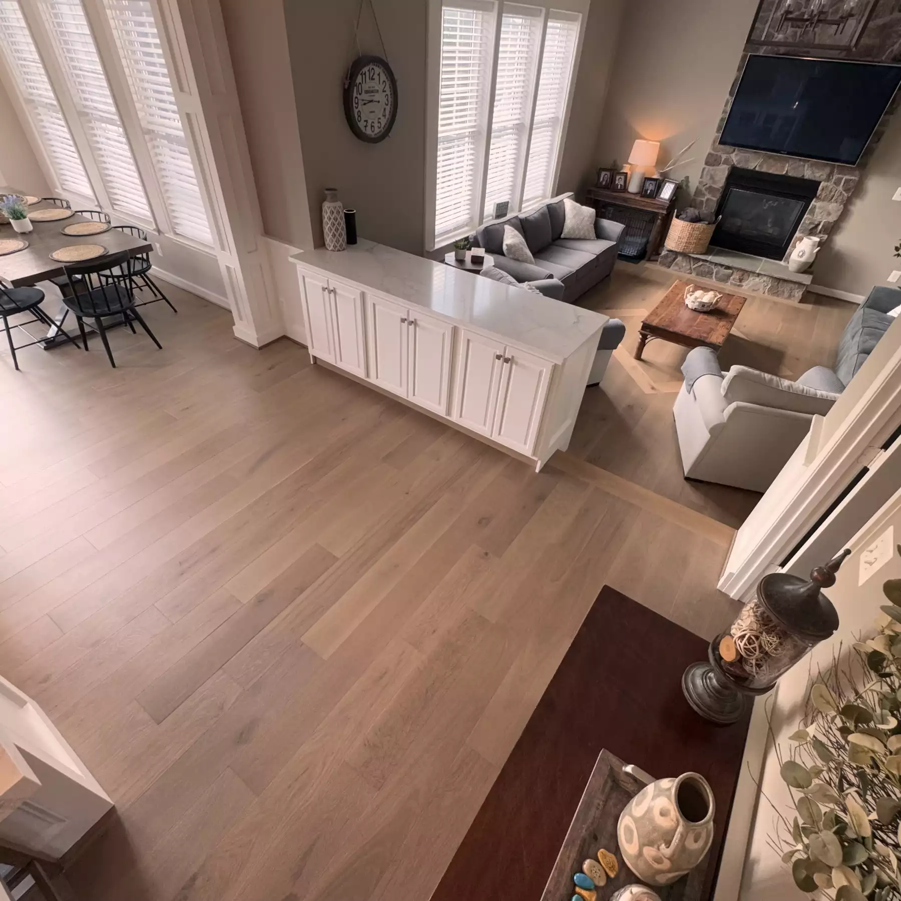 For this stunning home transformation in Taneytown, Maryland, trusted Mirage dealer Top Step Development completed a flawless installation of 1,800 square feet of White Oak Hattie Character Brushed flooring. While the mid-brown tones bring warmth and a comfy-chic vibe, the 7-inch-wide engineered planks offer exceptional durability. Their brushed texture makes them easy to maintain — an ideal choice for modern living.