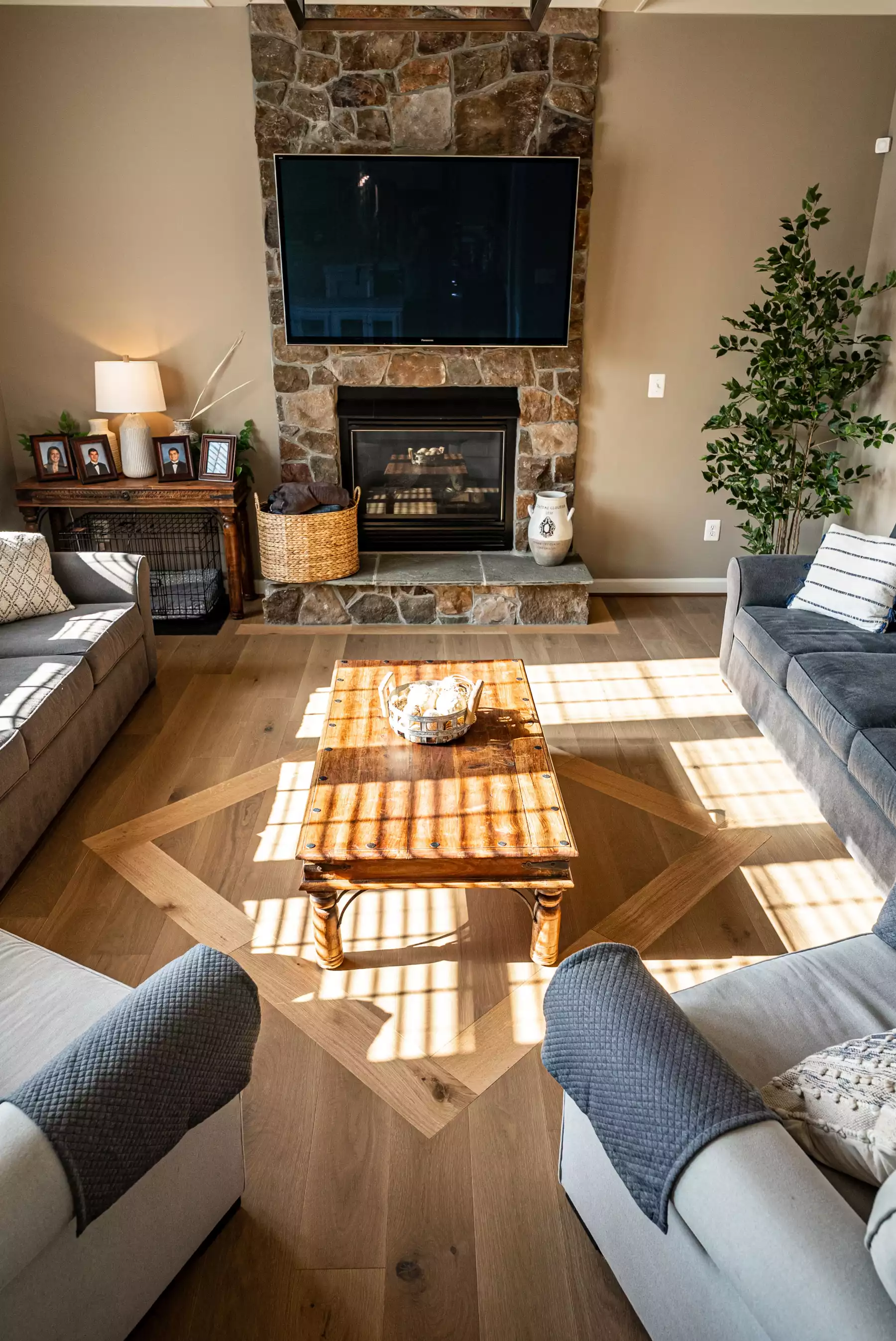 As a thoughtful finishing touch, a custom White Oak Natural insert was added in the living room, artfully framing the heart of the home — a welcoming space where family and friends gather. This elegant flooring choice reflects a clear commitment to quality craftsmanship, timeless design, and real-life functionality.