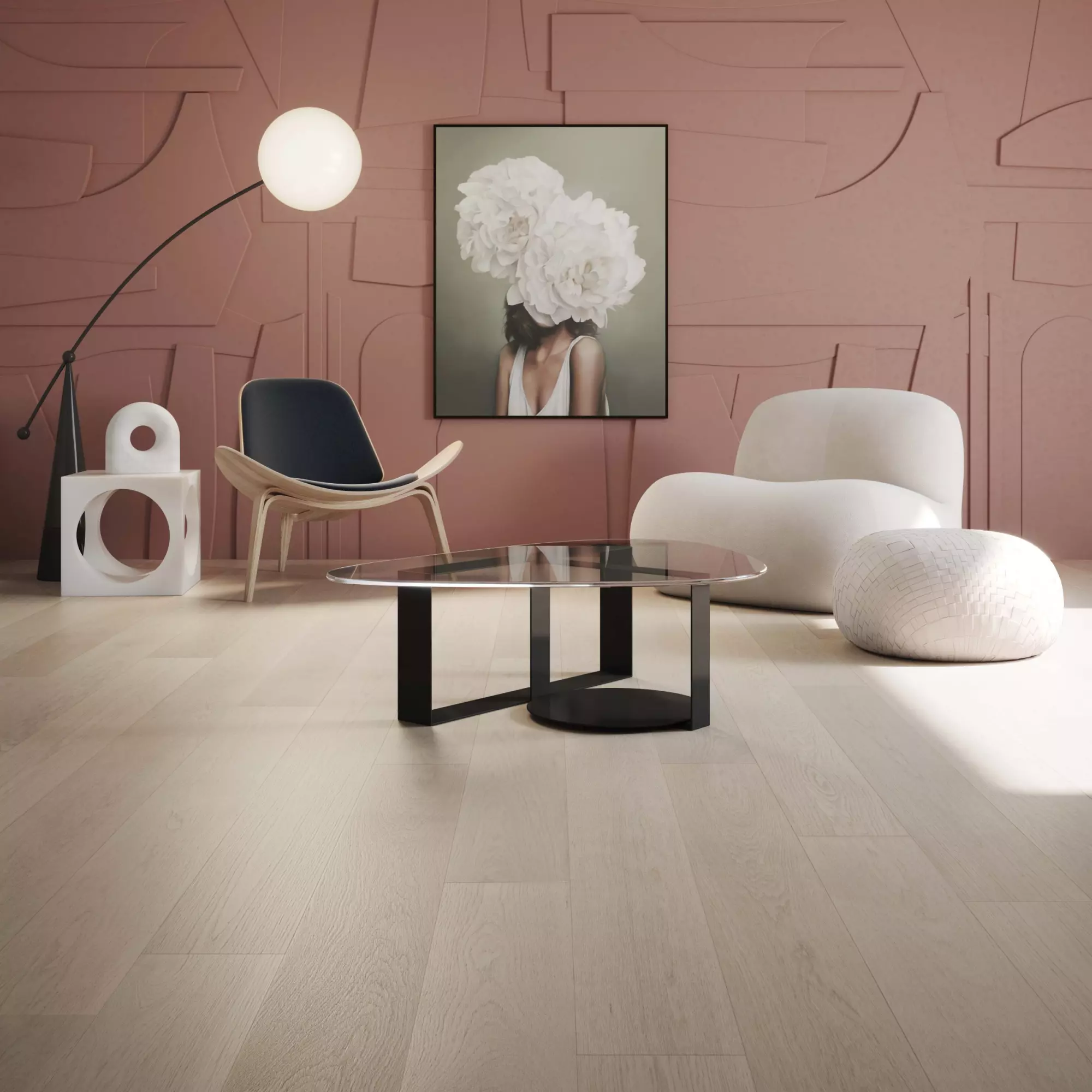 Give your home a beachy feel with a slightly whitewashed hue. The White Oak Ada Brushed hardwood floor colour provides a modern, streamlined look while retaining the wood's natural warmth and texture. This very soft, lighter wood tone can make your home appear larger, brighter, and more comfortable, giving it an airy feel and providing ample contrast allowing bolder and more colourful design elements to stand out in the overall design.