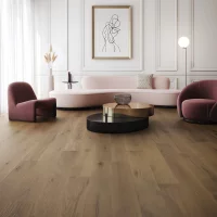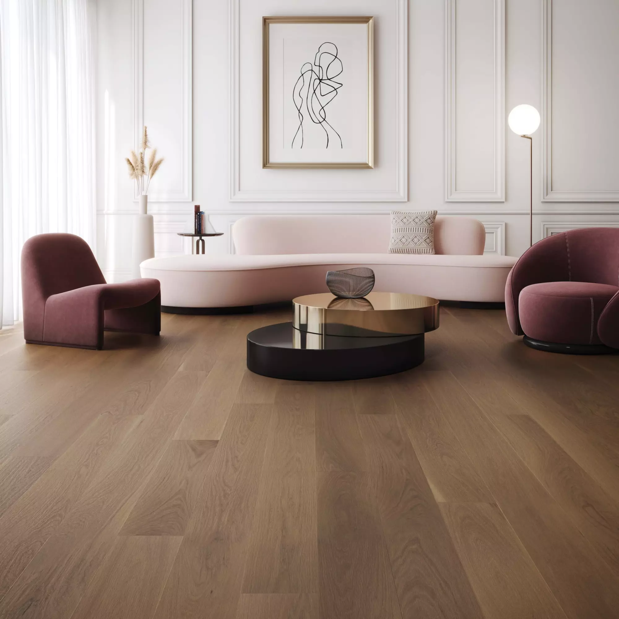 Style up your home with light brown wood flooring, a popular alternative to darker shades. The nutty brown hues of the White Oak Hattie Brushed floor subtly highlight the wood's natural grain to give any room an inviting homey feel. Warm neutral colours that are so in vogue now, such as taupe, mushroom, or khaki, will bring out rich, toasty notes.