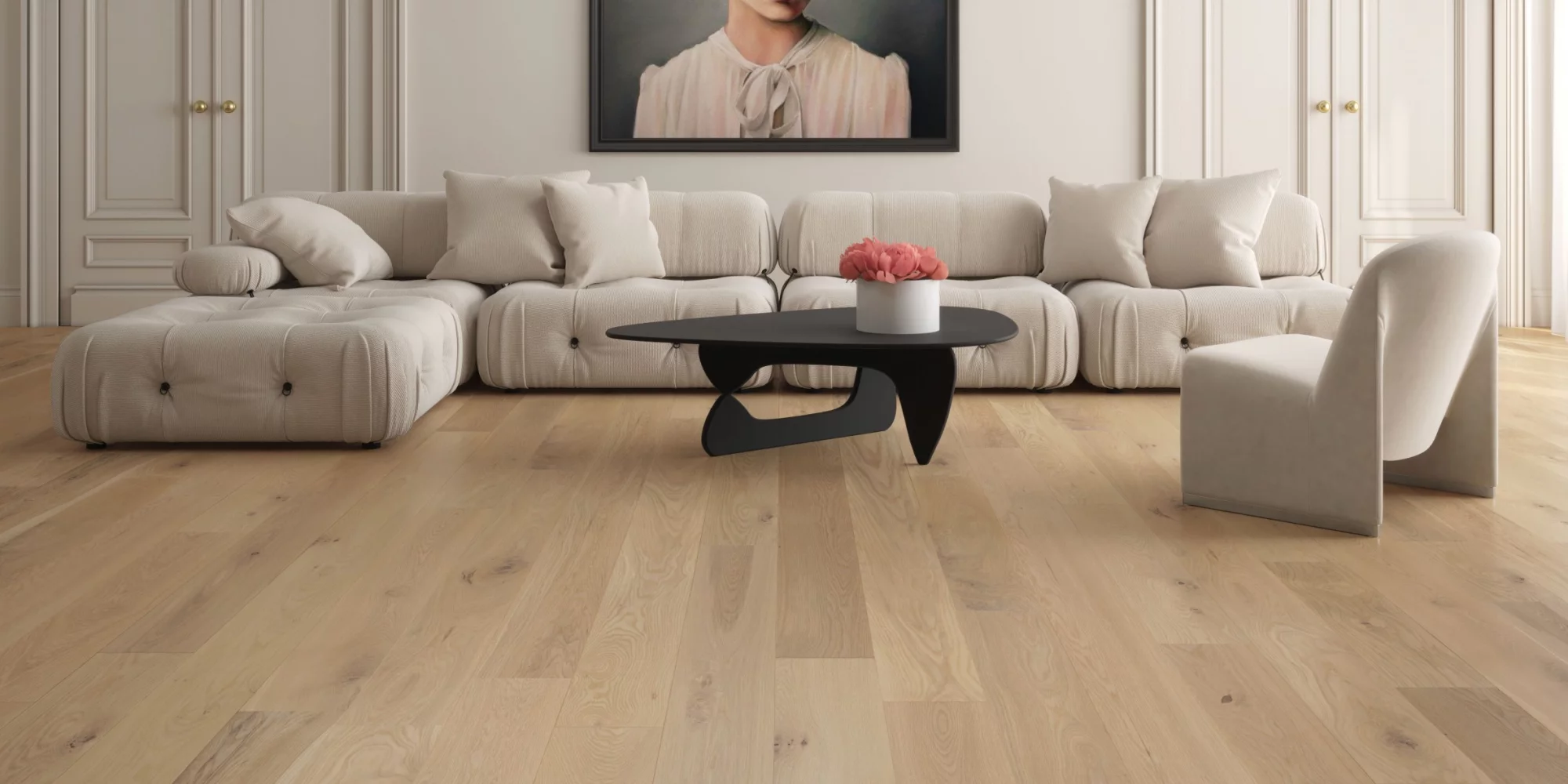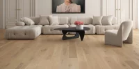 Raise the elegance factor of your home décor from the ground up with the distinguished White Oak Ingrid Brushed hardwood floor. Its neutral jute-like shade, complemented by underlying brown and tan tones, creates a striking contrast that infuses depth and character into any room. This makes it an excellent choice for statement living rooms, whether paired with either high- or low-contrast design elements.