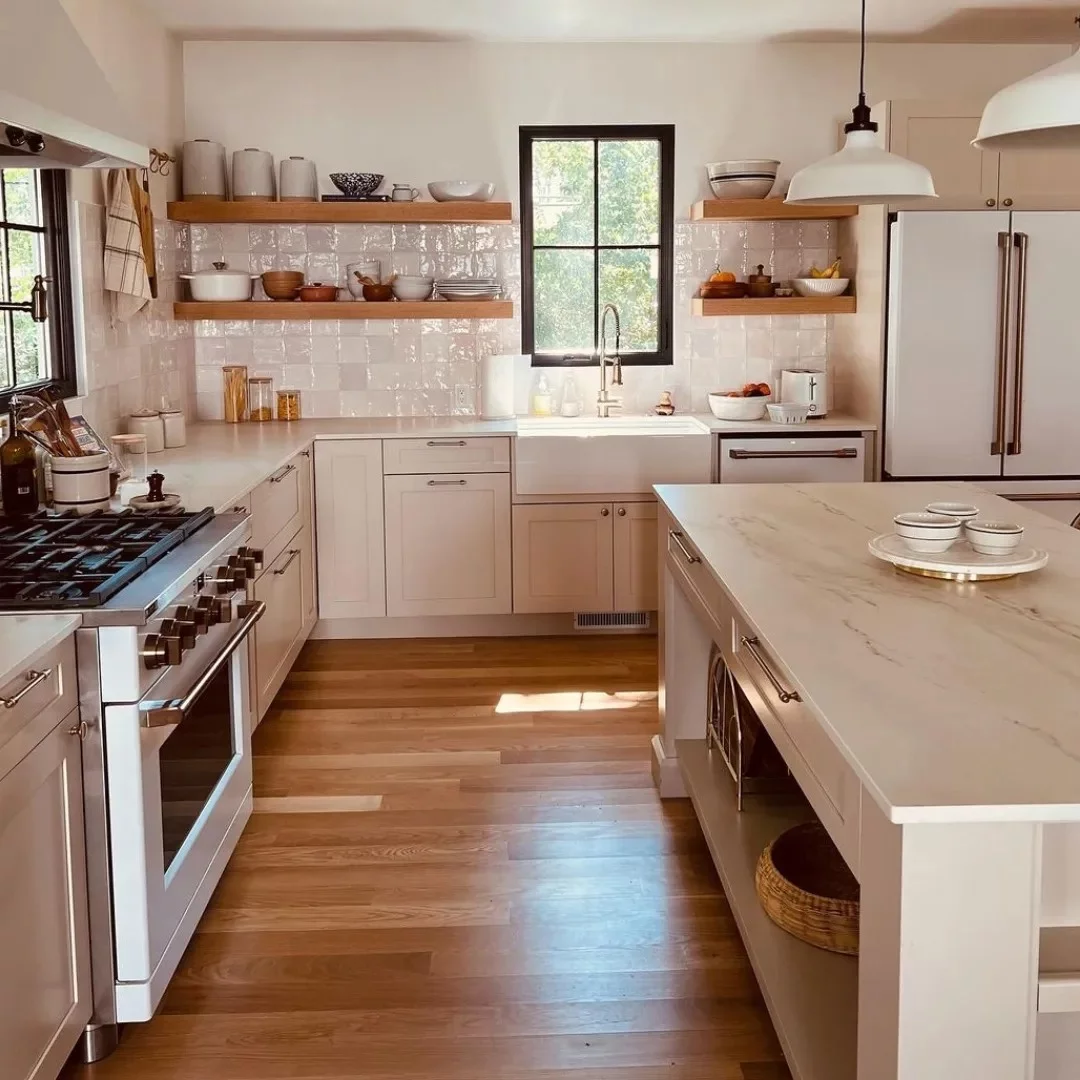 The timeless beauty of natural White Oak wood flooring adds warmth and sophistication to any space. Its rich grain complements everything from brick and marble to wood furniture and fabrics, creating a cozy, inviting atmosphere in this stunning Missouri home.