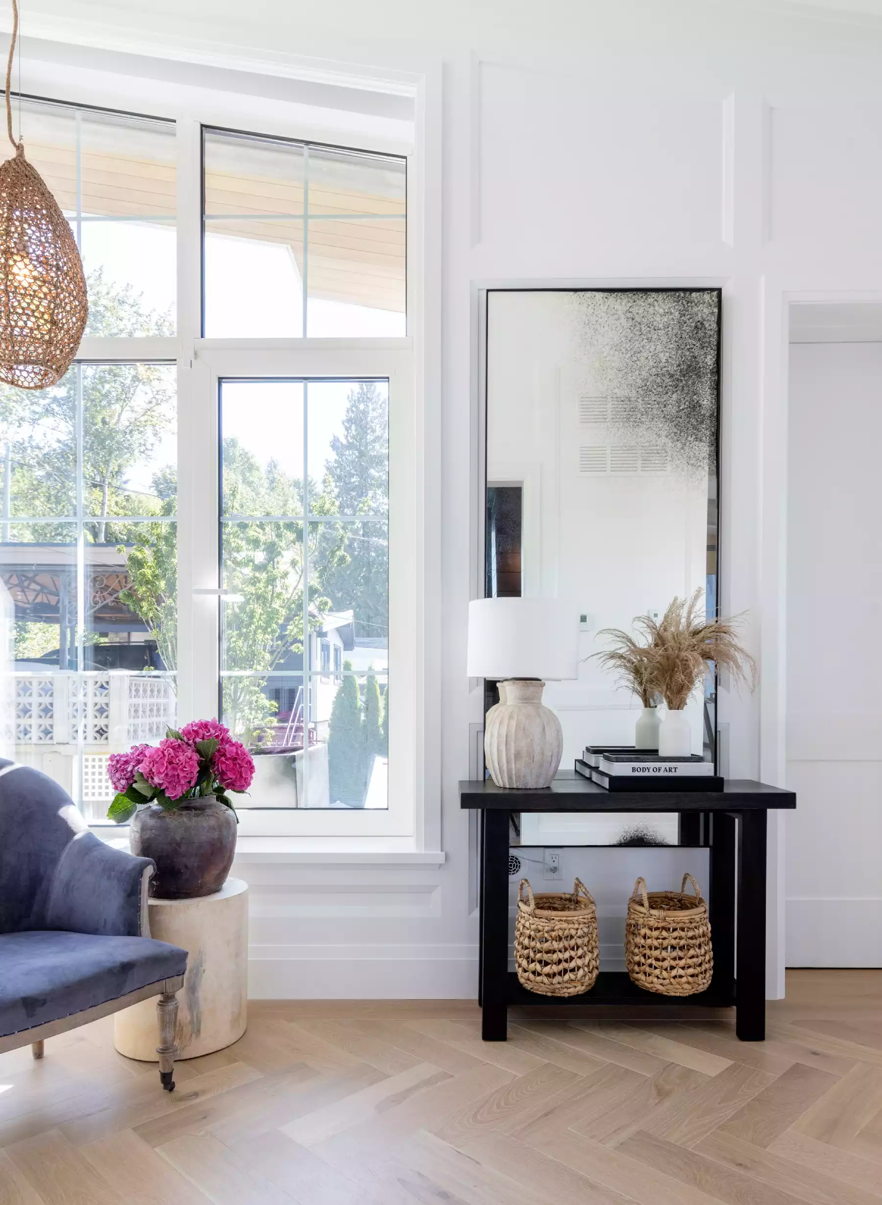 This ecru-inspired beige flooring captivates with its striking neutrality, beautifully balancing warm beige with soft greige and subtle gray undertones reminiscent of unbleached linen. Its calming palette exudes tranquility, reinforcing classic sophistication while adding a touch of refinement to a home that truly embodies the essence of bringing the outdoors in. Don't miss the stunning Herringbone insert in the entranceway, which adds an extra layer of elegance.
