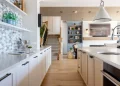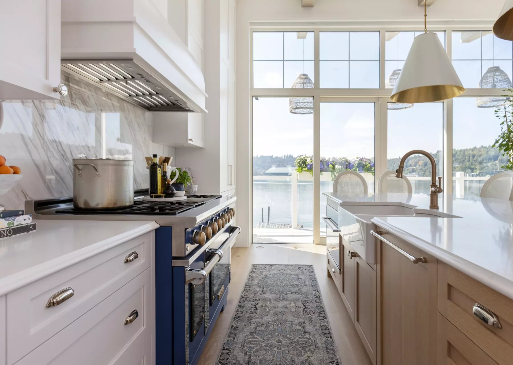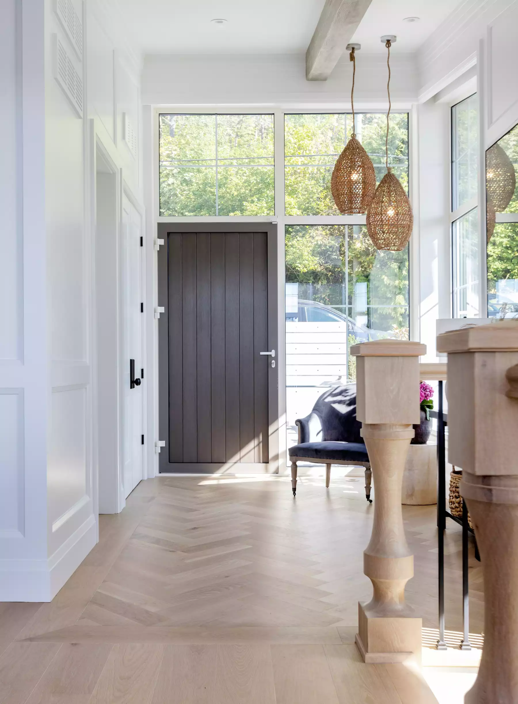 This award-winning design by the talented Karly Kristina Design, in partnership with Marcraft Homes, showcases a Hampton-inspired transitional style with elegant nautical touches. Every detail has been crafted to embrace the breathtaking ocean backdrop and enhance the waterfront living experience. Central to this aesthetic is the Mirage Floors' White Oak Hula Hoop Character Brushed wood flooring, sourced from Ethical Flooring.