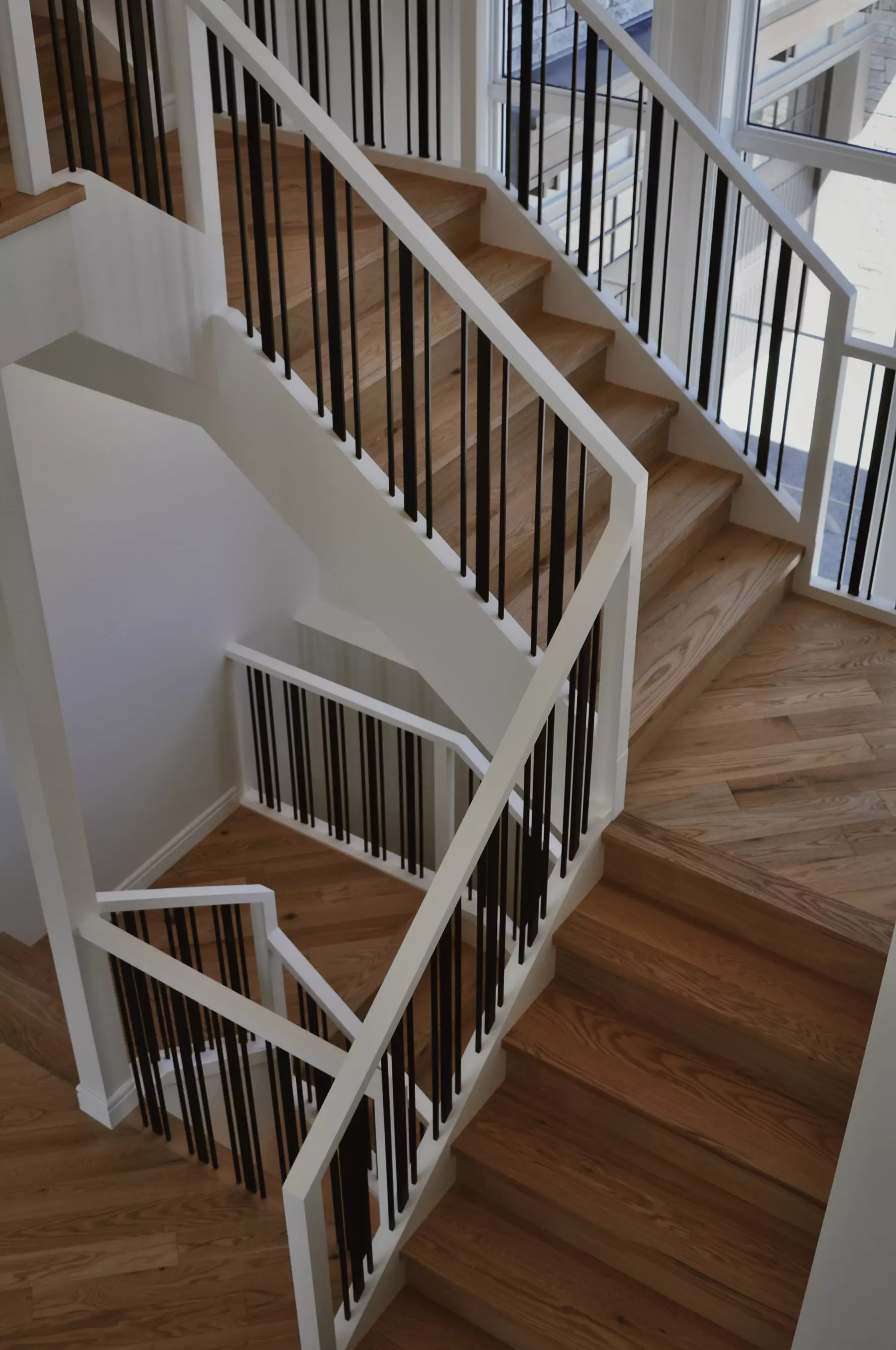 This modern Calgary, Alberta home showcases Red Oak Laguna Character Brushed hardwood floors installed on a diagonal for a striking visual effect. The eye-catching layout adds movement and personality to the common areas, from the kitchen to the staircase, and the sunlit living room.