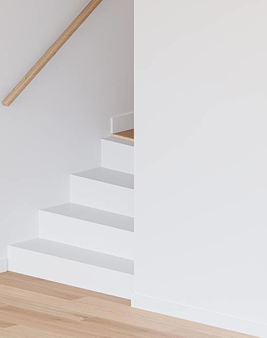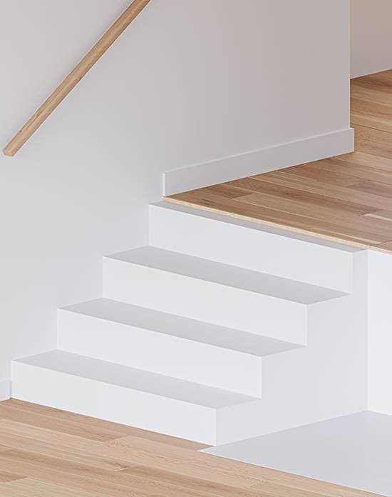 Elevate each step with perfectly matching hardwood stair components designed for enclosed stairs, offered in identical color, texture, and finish options to enhance the overall aesthetic of your Mirage wood flooring project and your home.